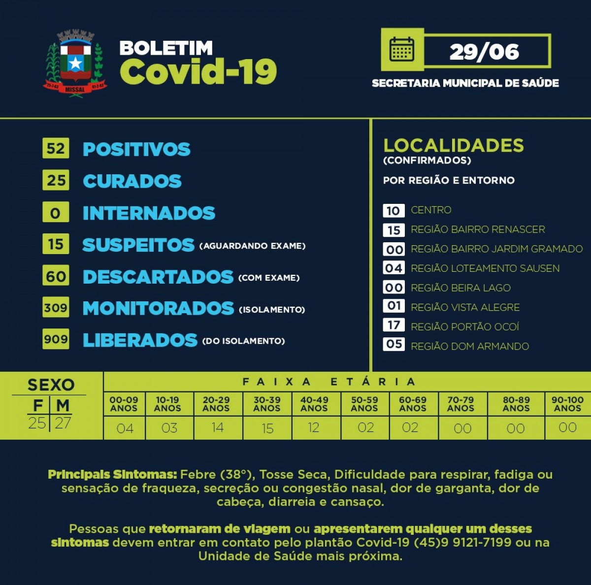 O boletim Covid-19 desta segunda-feira, 29 de junho, informa que o município de Missal está com 52 casos confirmados da doença. São 05 casos confirmados nesta segunda-feira, 04 via PCR e 01 por teste rápido. Ao todo são 42 casos confirmados por exame PCR e 10 por teste rápido. Atualizou também os números de curados, passando para 25. Portanto, casos ativos somam-se 27 casos.