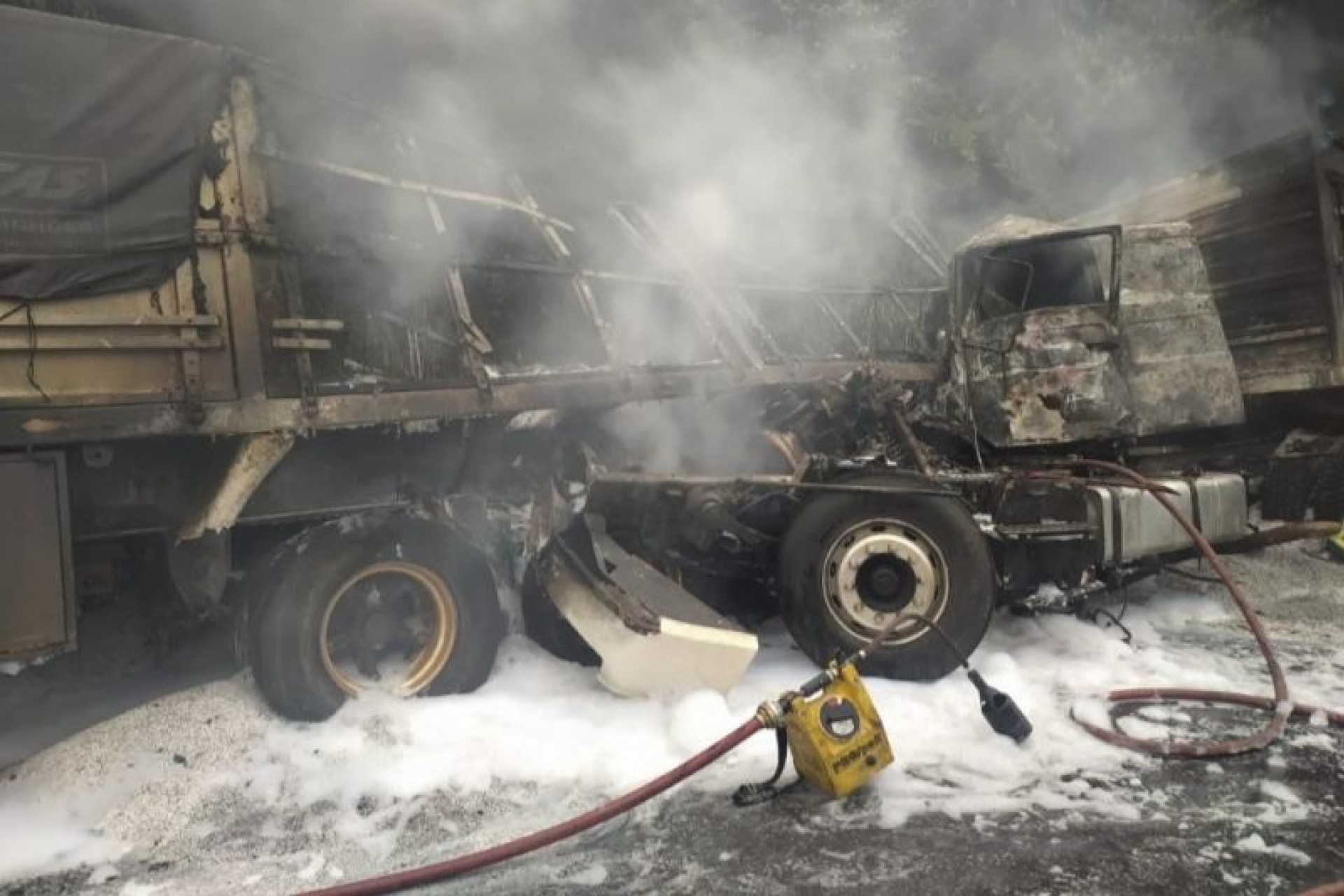Durante o trajeto, o filho perdeu o controle da direção do caminhão e bateu na carreta do pai, que seguia um pouco à frente.