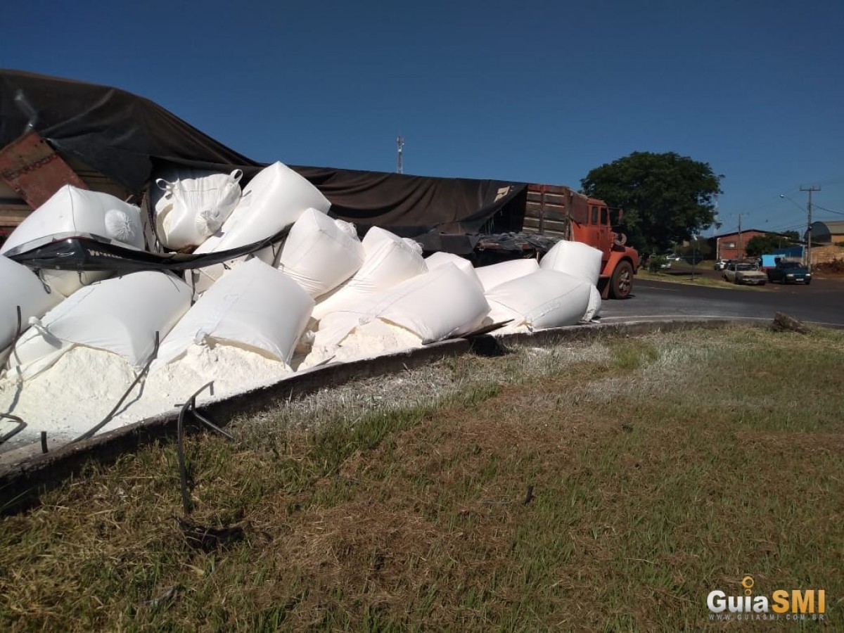 Na manhã desta sexta-feira, 29, a carga de bag’s com farinha que era transportada em uma carreta acabou se desprendendo do veículo e caindo na BR-277 em São Miguel do Iguaçu, no trevo de saída para Foz do Iguaçu.