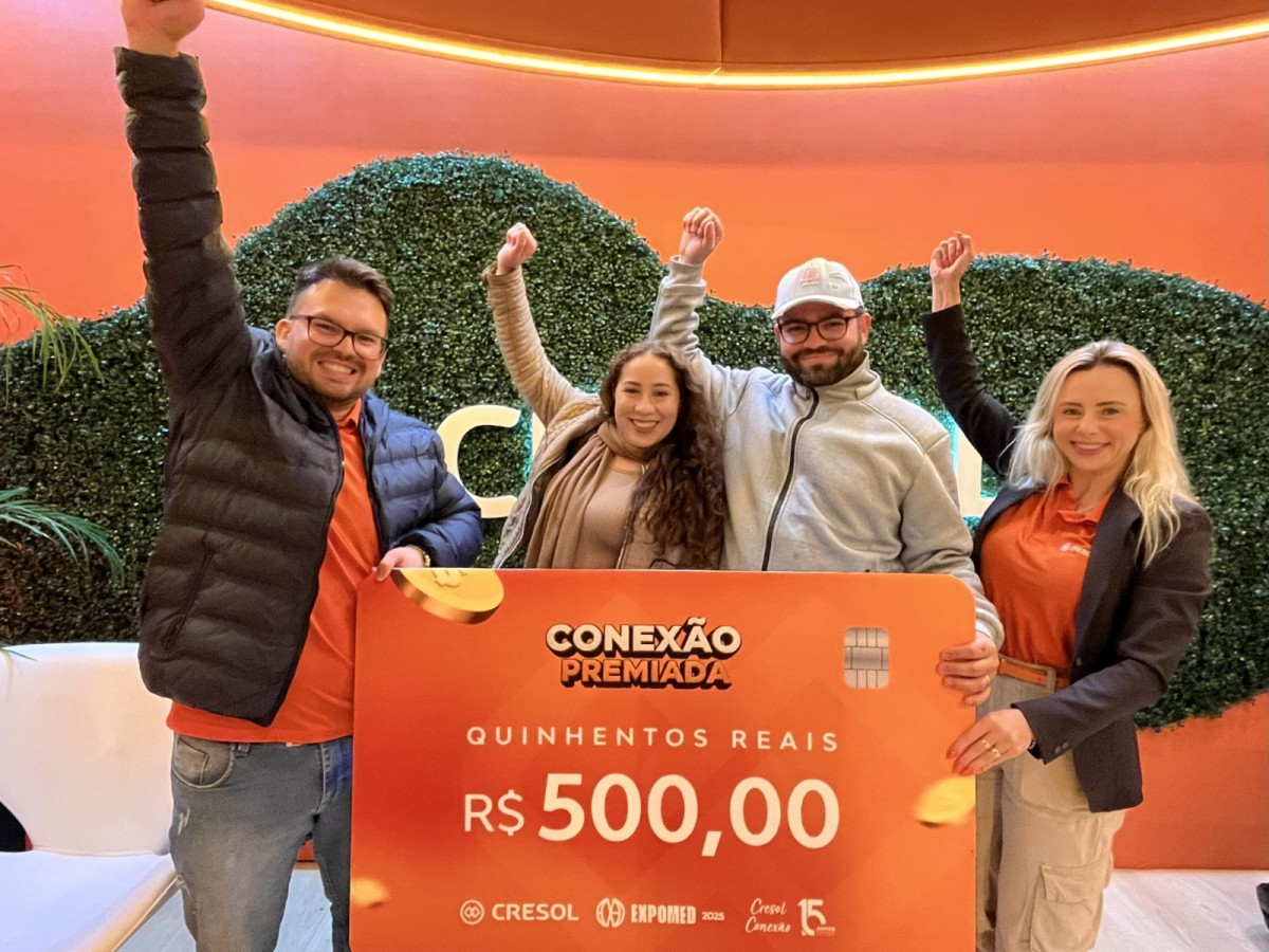 Entre os vários pontos de conexão da Cresol com os visitantes da Expomed, esteve a promoção Conexão Premiada, que sorteou 15 cartões de débito no valor de R$ 500,00 cada — uma forma de presentear os cooperados e a comunidade em geral que realizaram cadastro no estande.