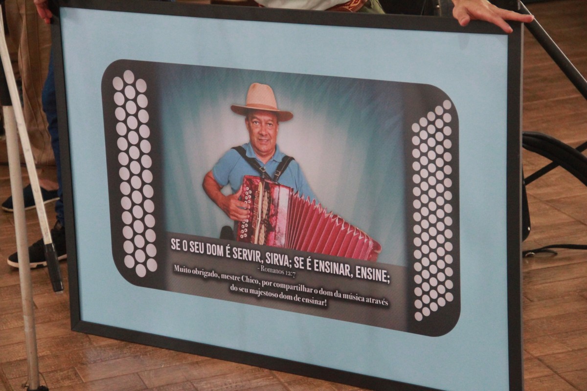 Chico saiu de casa para ir em um encontro de gaiteiros, e foi pego de surpresa por uma homenagem, ganhando uma bela gaita de presente. “Estamos aqui para celebrar a trajetória do nosso querido Chico, um mestre da gaita, um apaixonado pela música, e acima de tudo, um exemplo de humildade, disciplina e amor pelo que faz” explanou Felipe Mazzola.