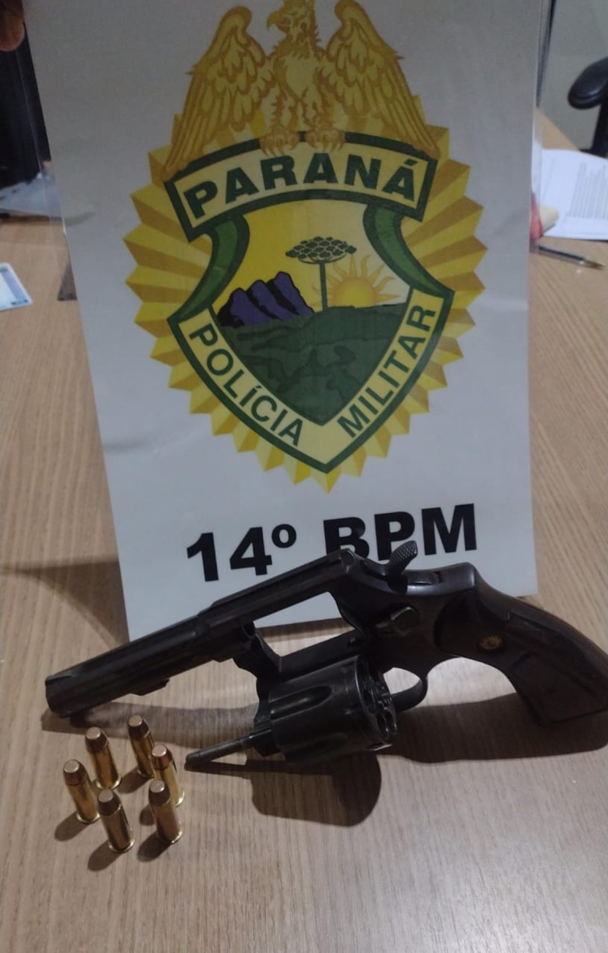 Com o suspeito, foi encontrado um revólver calibre .38, especial, marca Taurus, municiado com 06 cartuchos intactos.