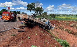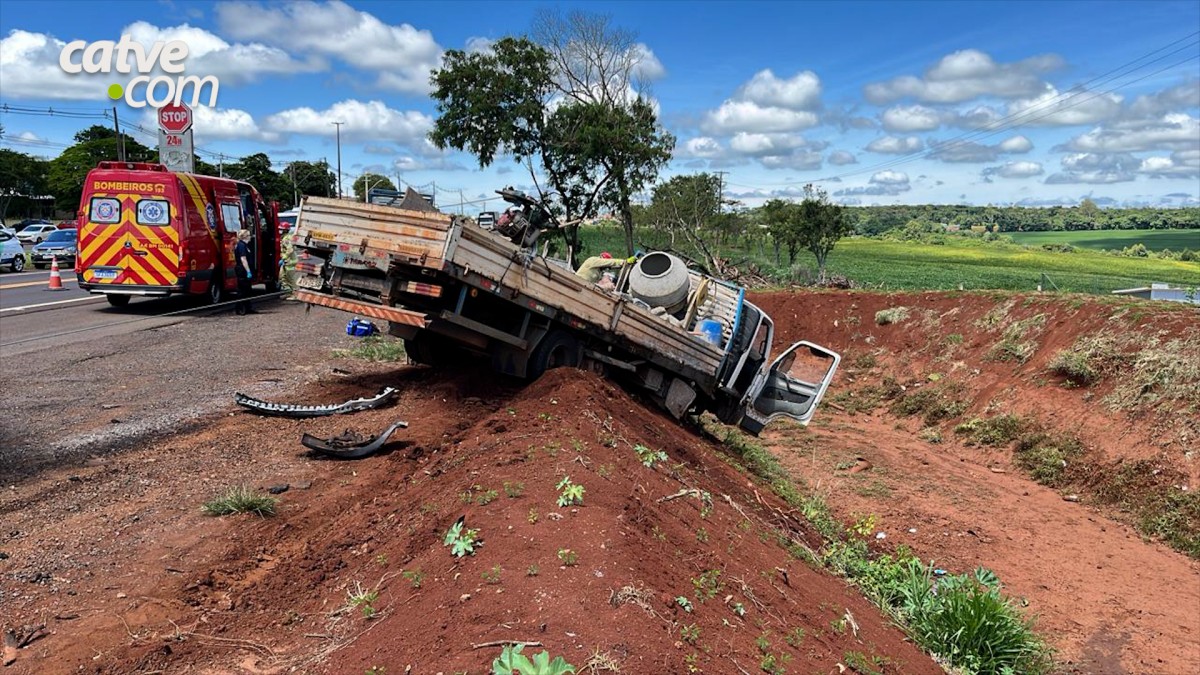 Equipe do Corpo de Bombeiros em caminhão ABTR (Auto Bomba Tanque e Resgate) precisou prender cabo de aço para segurar o caminhão e poder retirar o condutor que estava preso na cabine e com ferimentos moderados