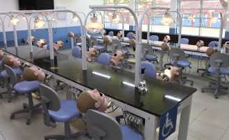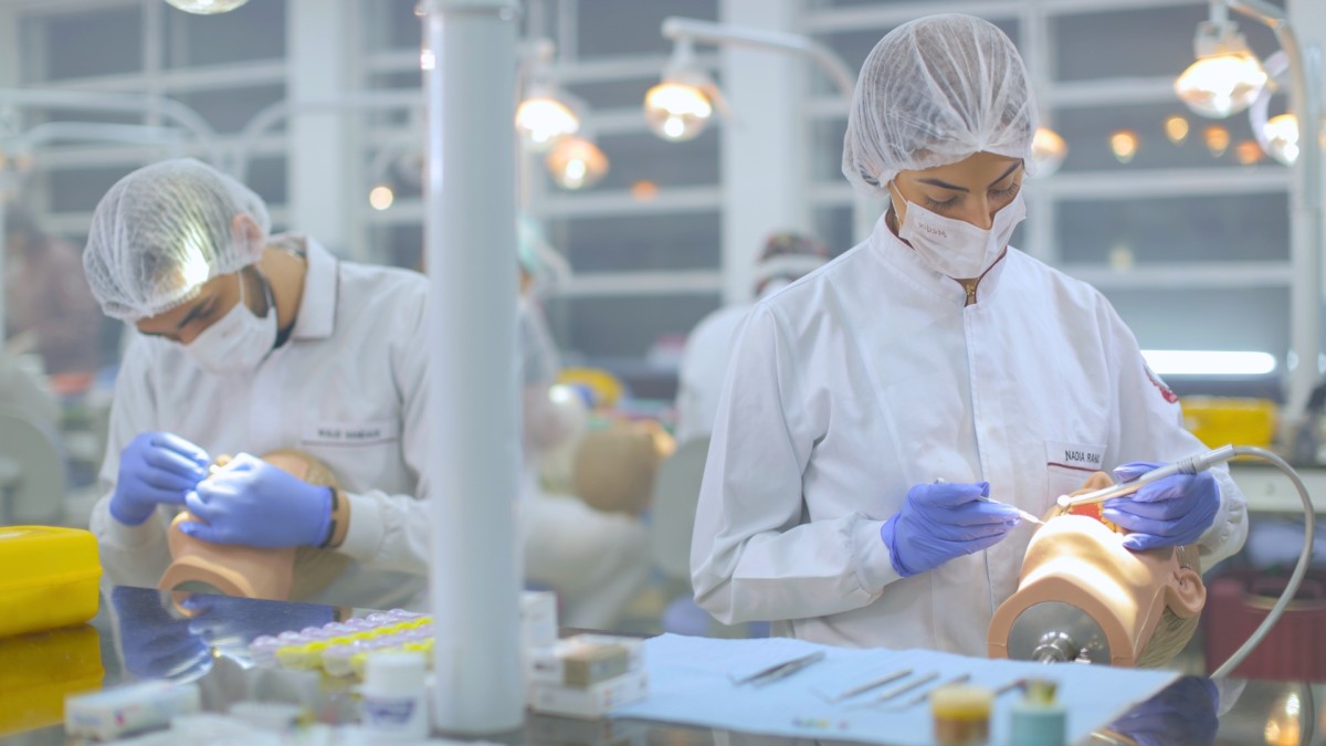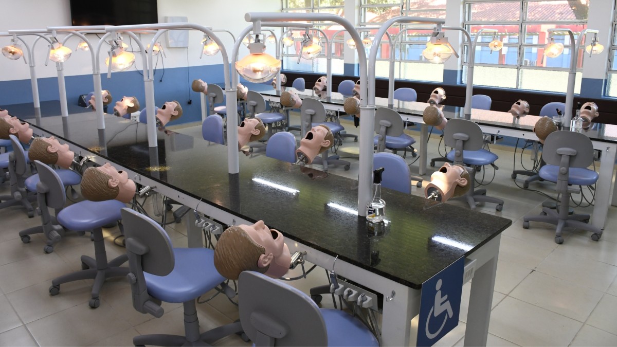 O curso conta com Duas Clínicas Escola, 38 consultórios odontológicos e mais de 25 laboratórios modernos, garantindo prática intensiva desde o início da graduação.