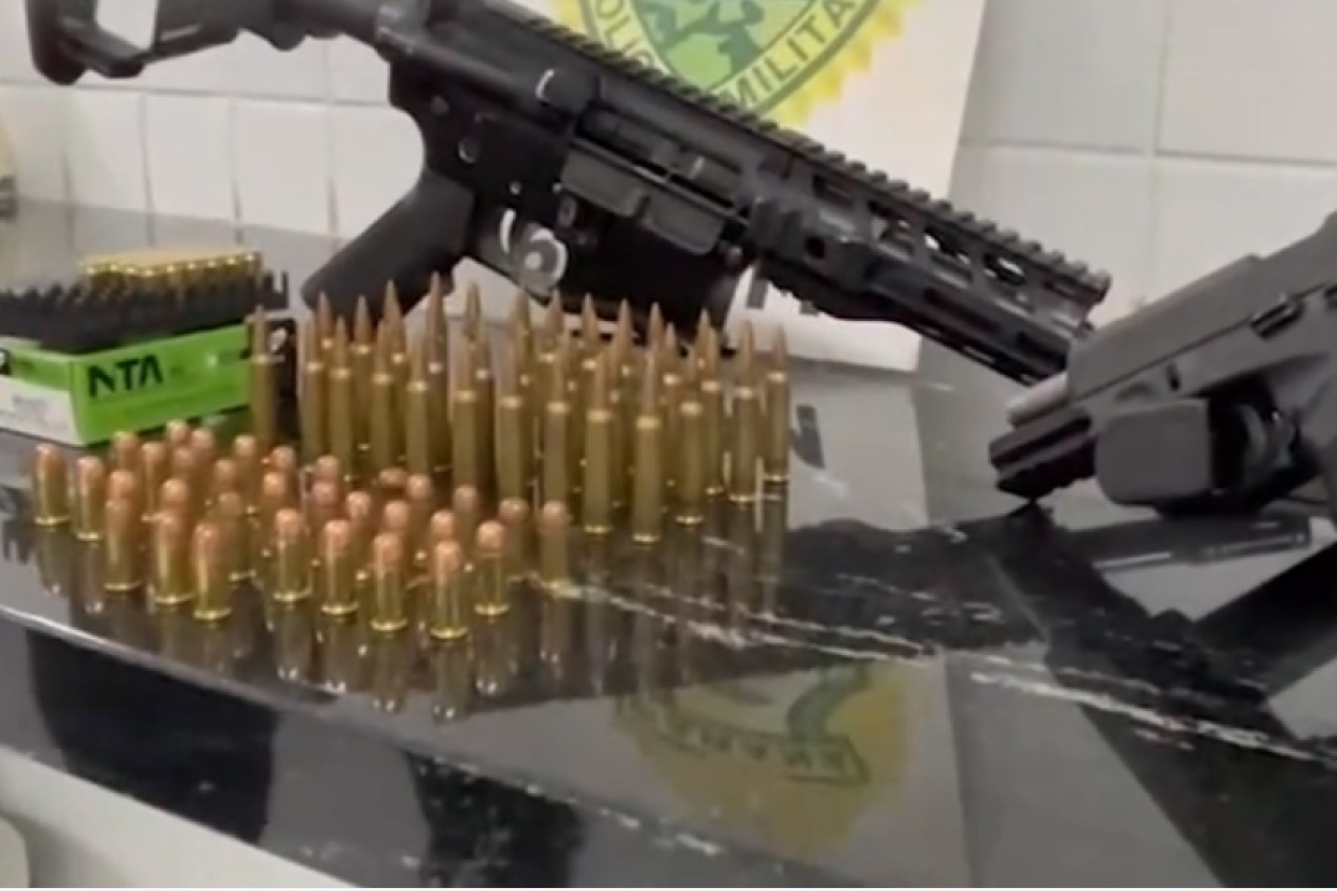 No total, foram apreendidos um fuzil Colt calibre 5,56, uma pistola Taurus .380, 40 munições de fuzil, 57 munições de pistola, 16 cartuchos deflagrados, além do veículo adulterado e um celular.