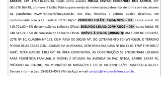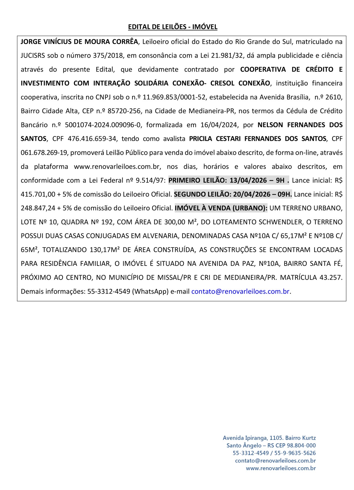 JORGE VINÍCIUS DE MOURA CORRÊA, Leiloeiro oficial do Estado do Rio Grande do Sul, matriculado na JUCISRS sob o número 375/2018, em consonância com a Lei 21.981/32, dá ampla publicidade e ciência através do presente Edital, que devidamente contratado por COOPERATIVA DE CRÉDITO E INVESTIMENTO COM INTERAÇÃO SOLIDÁRIA CONEXÃO- CRESOL CONEXÃO, instituição financeira cooperativa, inscrita no CNPJ sob o n.º 11.969.853/0001-52, estabelecida na Avenida Brasília, n.º 2610, Bairro Cidade Alta, CEP n.º 85720-256, na Cidade de Medianeira-PR, nos termos da Cédula de Crédito Bancário n.º 5001074-2024.009096-0, formalizada em 16/04/2024, por NELSON FERNANDES DOS SANTOS, CPF 476.416.659-34, tendo como avalista PRICILA CESTARI FERNANDES DOS SANTOS, CPF 061.678.269-19, promoverá Leilão Público para venda do imóvel abaixo descrito, de forma on-line, através da plataforma www.renovarleiloes.com.br, nos dias, horários e valores abaixo descritos, em conformidade com a Lei Federal nº 9.514/97: PRIMEIRO LEILÃO: 13/04/2026 – 9H . Lance inicial: R$ 415.701,00 + 5% de comissão do Leiloeiro Oficial. SEGUNDO LEILÃO: 20/04/2026 – 09H. Lance inicial: R$ 248.847,24 + 5% de comissão do Leiloeiro Oficial. IMÓVEL À VENDA (URBANO): UM TERRENO URBANO, LOTE Nº 10, QUADRA Nº 192, COM ÁREA DE 300,00 M², DO LOTEAMENTO SCHWENDLER, O TERRENO POSSUI DUAS CASAS CONJUGADAS EM ALVENARIA, DENOMINADAS CASA Nº10A C/ 65,17M² E Nº10B C/ 65M², TOTALIZANDO 130,17M² DE ÁREA CONSTRUÍDA, AS CONSTRUÇÕES SE ENCONTRAM LOCADAS PARA RESIDÊNCIA FAMILIAR, O IMÓVEL É SITUADO NA AVENIDA DA PAZ, Nº10A, BAIRRO SANTA FÉ, PRÓXIMO AO CENTRO, NO MUNICÍPIO DE MISSAL/PR E CRI DE MEDIANEIRA/PR. MATRÍCULA 43.257. Demais informações: 55-3312-4549 (WhatsApp) e-mail contato@renovarleiloes.com.br.