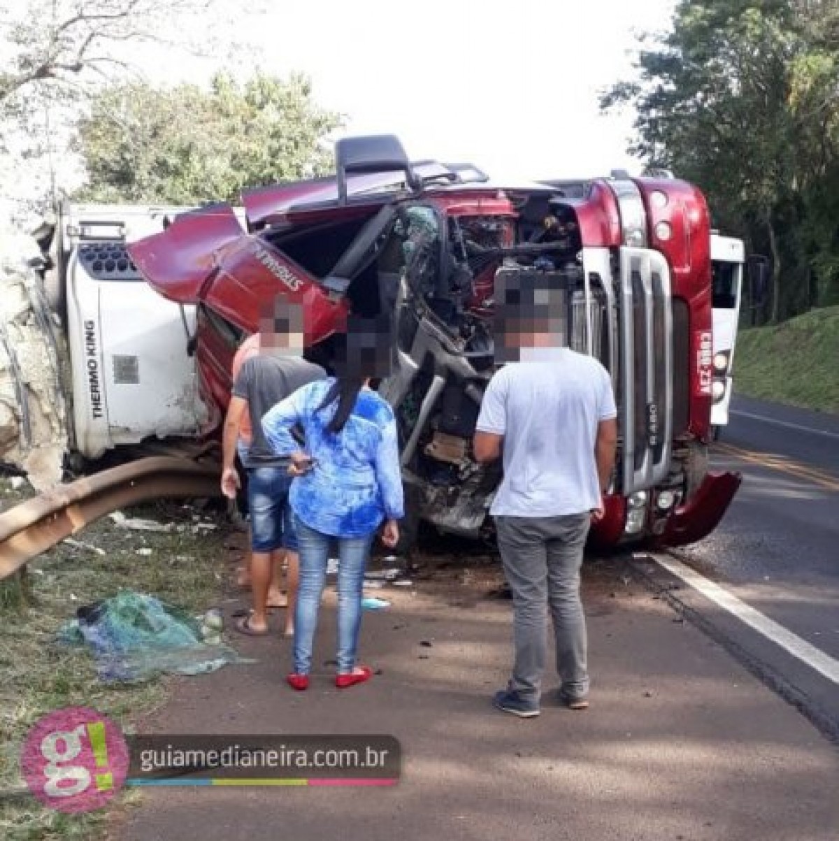 Uma carreta carregada de carne tombou na rodovia BR 277 entre Matelândia e Céu Azul.