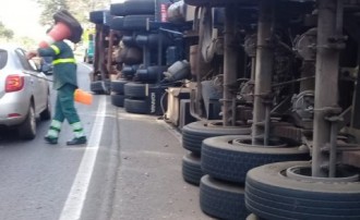 O fato foi registrado na tarde deste sábado (15), e de acordo com testemunhas, a carreta seguia pela rodovia quando o condutor aparentemente perdeu o controle da direção, vindo a tombar.